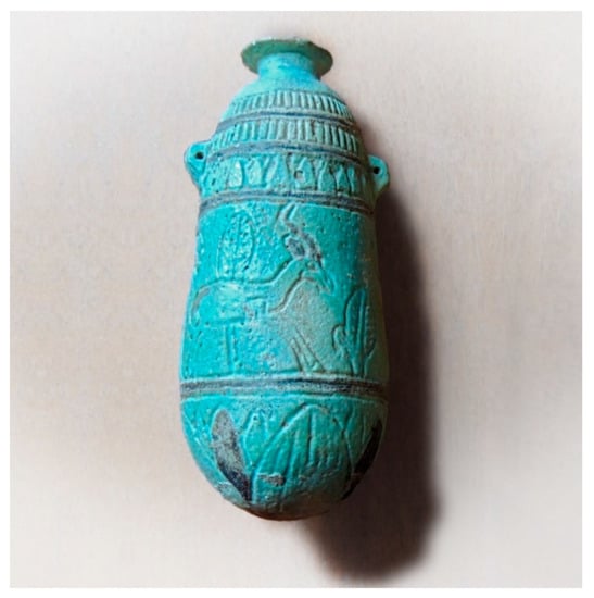 An antelope is easily distinguishable on a bluish-green faience alabastron (Figure 22).88 The ointment jar, dating from around the mid-7th century bce, was part of the goods of a cremation burial in the necropolis of Motya, along with silver jewelry and hard-stone scarabs, unfortunately not identified any further among the materials of the Whitaker Collection.89 To date we know of a dozen vessels of this type, preserved in various museums around the world, from different archaeological sites, but almost certainly all coming from workshops of the island of Rhodes.90