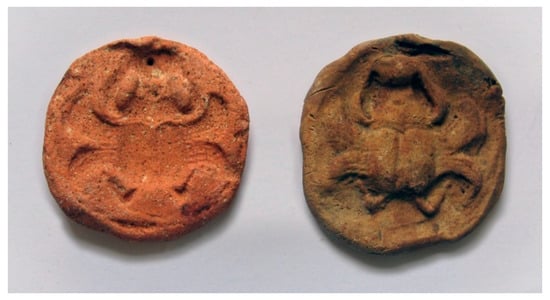 This overview of the animal iconography from Motya ends with depictions derived from ancient Egypt. Egyptian artifacts, not infrequently centuries older than their archaeological context have been excavated across the Mediterranean. Their vast dispersal serves as an apt demonstration not only of the enduring attraction of the mysterious culture of the Nile valley, but also the wide interconnectedness of the ancient world. Among the objects that are directly connected to Egypt, first in line are scarabs. Although beyond the Nile Valley they may lose their religious or magical significance, they could also be used as seals by impressing the flat, engraved side on wax or clay, as a sign of personal identification.95 These scarabs can be quite naturalistic and detailed; they are often made of glass paste, and could be used as personal adornment or as amulets—to be suspended from a cord as the holes in some specimens indicate (Figure 23). A terracotta cake mold also shows a scarab, demonstrating its continued cultic importance.96 In Egypt, the scarab was associated with the solar cult, particularly the rising sun. Indeed, the habit of the dung beetle of rolling balls of dung reminded the Egyptians of the solar cycle.97 The divine personification of the rising sun was called Khepri in Egyptian, a scarab-headed deity, whose name (Ḫprỉ) refers both to the beetle (ḫprr) and the act of coming into being (ḫpr), all of which was written with the hieroglyphic sign of the scarab (𓆣).