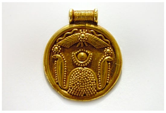 Egyptianizing scene with two cobras (uraei) (MGW inv. no. 1870); gold pendant; ca. 4th century bce.