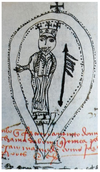 Within the scope of iconography validating the warrior character of early kings, it is interesting to observe two ink drawings that represent two older pendant seals, as a means to record previous stamp elements when they came into disuse (copy from Foral de Penas Roias do Livro de Doações de Afonso III, IANTT, Gavetas, gav. 15, mç. 10, doc. 14 and Livro das Doações de Afonso III, fol. 13v,o). The drawings were produced in the second half of the 13th century and in the 14th century, respectively, and reproduce both the shape of the stamps and the king’s effigy consisting either of a single seal matrix or two similar ones. Both drawings represent the effigy of King Sancho I (r. 1185–1211) in majesty (Branco 2005, p. 162). The authors of the respective documents in which we find these equally rudimentary and expressive representations were almost certainly also the artists of the drawings, although their concerns were less artistic than iconographic. They were interested in accurately representing the figure of the king in the old seals, with his regal coronation accoutrements. The king is portrayed in his solemn attire, one arm raised with his hand gesture suggesting the offering of a blessing to his subjects (Branco 2005, p. 162). The crowns in both drawings are faithful copies of the originals: opened and topped, not by fleurs-de-lis, but rather by the Greek Cross, as it was used in Portuguese metalworking during the 12th and early 13th centuries. These are the only representations of a first dynasty king displaying his sword, spurs (both symbols of his warrior-like character) and banner (Fernandes 2005, p. 584). In the 14th century representation, the banner is shown suspended on air in the left flank, while the 13th century drawing displays it as being grounded. To sum up, the crown remained a privileged insignia of royalty, but the sword was replaced by the banner; this is an image that evidences the warrior nature of early kings as military leaders and guardians of important victories in the battlefield (Figure 3 and Figure 4).