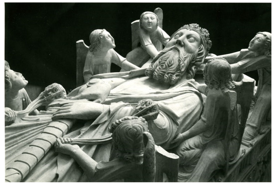 Pedro I was king for 10 years only, but he took good care of his social image, although there is not any written or visual documentation left to inform us about his coronation ceremony. This occurred for certain, but apart from the crown and the sword, the king’s iconographical record is limited to his sarcophagus, where he is presented as knight-king in an imposing statue, dressed in a long and solemn garment, holding the sword sheath with both hands and wearing a crown apparently sculpted after actual gold smithery models. In the scene at the top of the sarcophagus, where he is represented on the upper axis of the Wheel of Life as an enthroned king, only the solemn garment is visible. Neither his crown nor the objects he held in his hands survived due to the advanced state of deterioration of the stone (Figure 5).