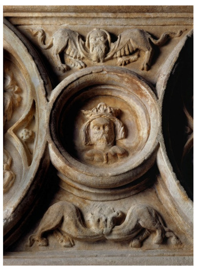 The second statue, presumed to represent the same monarch, is incomplete, broken in two at some point in time, and all that is left is the upper part of the body. Interestingly, the most valued regal attributes are still the crown as an essential element, the sword which is also of great size and placed over the shoulder as well as what was probably a scepter, shaped at one extreme as a Latin cross and held by the king on the side. The manner in which a string of beads fastens the sword’s sheath is unprecedented. As for the cross and from the way that the hand holds it, there is no indication that it was attached to an orb, or any signs that a globe even existed. However, the hand’s position offers the possibility for the existence of some sort of rod that may have disappeared with the lower part of the body. The eyes, the worn out beard and the hair sculpted in grey marble are all consistent with western figurative art from the 12th and 13th centuries. All of these features can be representative of both Afonso Henriques or of his son Sancho I. The sculpture was initially placed at the Church of Santa Maria da Alcáçova, and was perhaps moved to a door niche at the same place before being taken to the Archaeological Museum of Carmo in Lisbon, according to the museum’s old inventory (Fernandes 2005, p. 342; Fernandes 2017, pp. 77–83) (Figure 2).