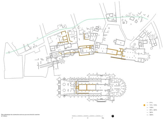 Phase of construction of the Abbey of Saint-Denis according to the archaeological research of Michaël Wyss: 1. Abbey Church. 2. Sainte-Geneviève Church. 3. Saint-Michel-du-Degré Church. 4. Saint-Barthélémy Church. 5. église des Trois-Patron. 6. église Saint-Michel-du-Charnier-Saint-Symphorien et chapelle de la Vierge. 7. église Saint-Pierre. 8. église de la Madeleine. 9. église canonial Saint-Paul. 10. bâtiment carolingien. 11. Aqueduc. 12. maison de la Cène. 13. Celiers. 14. maison du chantre de Saint-Paul. © Sebastian Baumann.