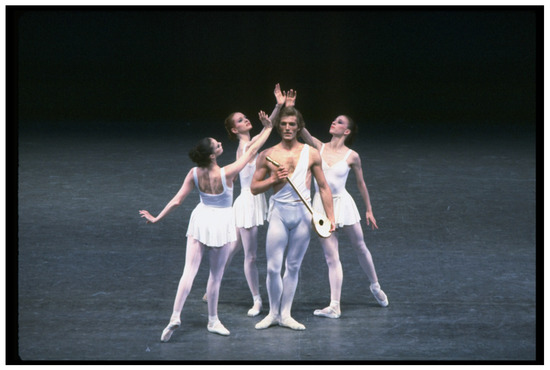 According to Balanchine’s vision, then, elements seen as essential were carefully considered, and those remain in the ballet as performed today. Through subtraction, the choreographer arrived at a spare design that accented the choreo-musical legibility. Balanchine even left certain, carefully selected, referential elements that infuse the ballet with story-like properties: the props, including Apollo’s lute, and the Muses’ signifiers of lyre, mask, and scroll. The ballet itself is then a very good illustration of the Balanchine dilemma about abstraction. Balanchine’s verbal rejection of abstraction notwithstanding, the outcome of the process of abstracting has produced visible effects within the work and aligned them with definitions of abstraction. Apollo particularly may closely exemplify Susan Manning’s continuum of “mythic abstraction” whereby “choreographers represented dancers as inhabitants of abstract worlds” (Manning 2004, p. 118)—even with the aforementioned referential elements, which may prompt us to question its non-narrativity. But, if we continue to inquire into the duality of representation and abstraction, coupled with Balanchine’s propensity toward eliminating, we may be encountering a visual aesthetic of “semantic abstraction.”