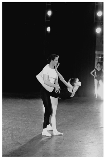 Although he was not the only ballet choreographer to experiment with such a pared-down aesthetic, Balanchine’s monochrome designs are emblematic of his opus.27 Particularly in the period of 1950s–1970s, he proliferated a number of structurally focused explorations that shifted away “from lavish and referential costuming” toward “simple body coverings reminiscent of classwork [attire] which forefronted what the body was doing” (Preston-Dunlop and Sanchez-Colberg 2002, p. 22). Those works accentuated the dancer’s performing personality, rather than treating them as characters in a story. Led by musical scores, the choreographer deployed a full range of motion afforded by the medium so as to arrive at precise choreo-musical responses. He developed a style of ballet training that famously extended dancers’ range of musical eloquence28—a spectrum of soft and rounded, as well as angular, three-dimensional postural and gestural actions, expressed a dancing response to the unaltered tempi.29 His movement style involved speed, variability, and expansive qualities. Dancers famously travel across the stage as if to devour the space through movement, often with swift shifts of bodily orientation. Balanchine’s choreographic legibility thus deeply highlighted dancers’ subtle and surprising physical explorations and spectators delighted, as Denby suggested above, in a range of actions which originate deeply from the body.