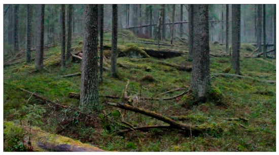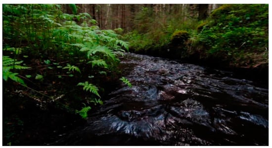 The film, the book and the short documentaries portray biodiversity and harmony within a primeval boreal forest that has not been destroyed by humans. The forest is shown to be home to both small and big animals, fungi and various plants. The portrayal mostly consists of forest interiors, ponds and streams, woodland-fringed watercourses, big trees and peculiar rock formations (Figure 1 and Figure 2). The depicted forests are rated as very valuable habitats and are protected by The Finnish Forest Act or Nature Conservation Act. In addition, a multitude of deadwood, characteristic of primeval forest, appears in the works. The change of seasons forms a loose dramatic arc in the film and book, but the depiction of the species and forest remains rather fragmentary.