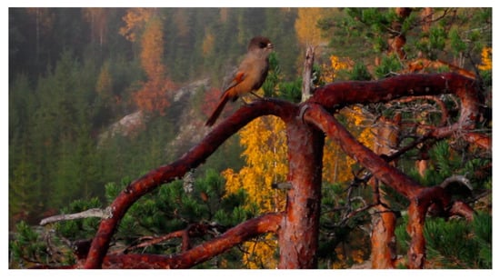 Birds are the major objects in over 90% of pictures, including birds in the book, but only 40% of shots included birds in the film. This is because birds often vocalize in the background without a connection to their visual appearance. However, vertebrates are preferred objects in the images even though they are a small proportion of Finnish biodiversity. The most depicted species in the film and of the animal species in the book is the Siberian jay (Perisoreus infaustus). The most depicted plant species in the book is the old pine tree, the mystical tree of life. Other plant depictions are mainly neutral. Images of fungi, insects and mosses on old trees give an impression of the biodiversity in an old forest ecosystem.