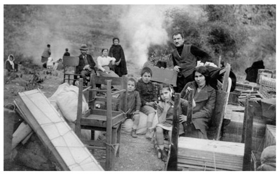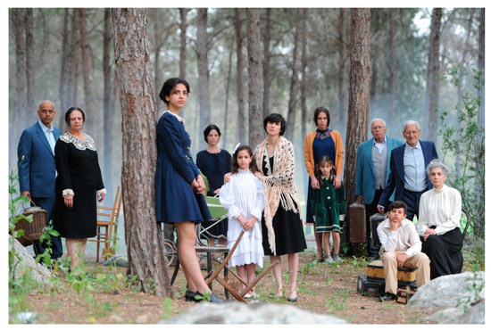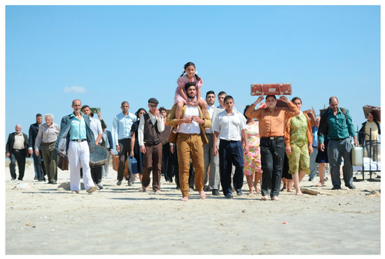 Raida Adon’s dramatic and epic video takes its inspiration from many visual references: children’s books, famous paintings, and historic photographs (Mendelsohn 2020). Some of her references stem from Jewish history and art that dealt with wandering and the state of being a refugee, forced to leave their home to an unknown future. A famous example of a (now lost) depiction of Jewish refugees is Galut (Diaspora, 1904) by Polish Jewish artist Shmuel Hirszenberg (1865–1908). The large painting depicts Jews marching in the snow in the middle of nowhere, most likely after a pogrom, carrying their belongings, their future unknown. Adon may not have known this particular painting but it stands for a whole world of references—photographs and paintings—that depict wandering people in search of a home. Similar images can be found in totally different contexts: Palestinian refugees leave their villages in 1948, refugees from Syria walk in the desert with sacks and suitcases after having been forced to leave their home. A photograph taken in 1917 in the (then empty) territory between Jaffa and Tel Aviv tells an interesting and not well known story of Jews that were expelled from Jaffa and Tel Aviv in 1917 by the Ottoman Authorities a few months before the British conquest of the region (Figure 1). Men, women, and children are seated with their belongings outside, some holding their children on their laps, looking at the camera, their future unclear. All these accounts of human tragedy served as inspiration for Adon’s work. For her, the fate of Jewish, Palestinian, Syrian, or any other group of people engender the human state of strangeness and alienation caused by war and violence (Figure 5).