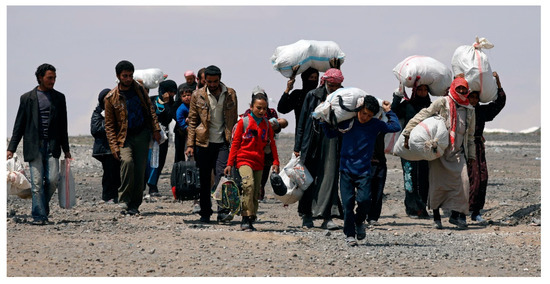 Syrian refugees who fled the city of Raqqa leaving a camp in Ain Issa, Raqqua Governorate, 2017, Reuters News Agency.