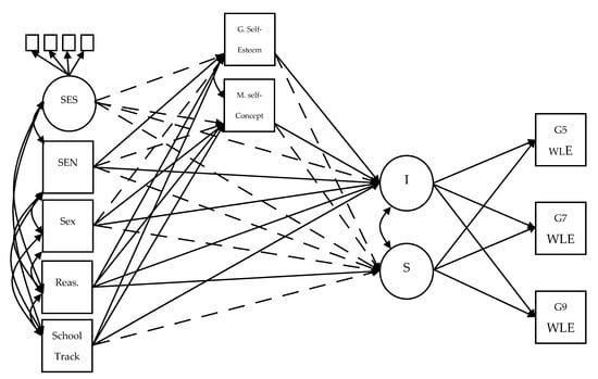 Mediation Model—Math. This figure describes all pathways used in the mediation model. The no mediation model was calculated by zeroing out regressions from and onto the mediators. Solid lines indicate significant paths, and dashed lines indicate non-significant paths. G5 WLE, G7 WLE, and G9 WLE refer to grade 5, 7, and 9 weighted likelihood estimates (WLE), respectively. I refers to intercept. S refers to slope. M. Self-Concept refers to math self-concept. G. Self-Esteem refers to global self-esteem. SES refers to socioeconomic status. SEN refers to special education needs. Reas. refers to nonverbal reasoning scores.