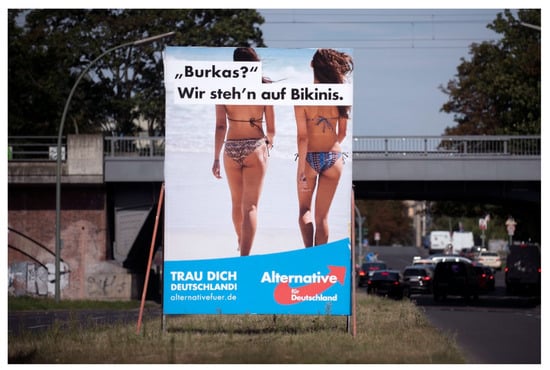 In order to interpret and contextualize the poster in Figure 1 in the empirical findings section, I trace how the AfD’s campaign appropriated issues such as gender equality and sexuality, coopting topics previously owned by left-wing social movements (cf. Farris 2017; Fielitz and Marcks 2020). Figure 1 is a good example of what feminist scholar Sara Farris has termed the femonationalist rhetoric of mainstream anti-immigration discourse overlapping with far right nationalist political agendas in Western societies (Farris 2017). Femonationalist rhetoric is defined by its appropriation and distortion of feminist ideas of gender emancipation for the stigmatization of migrants, ethnic minorities, and Muslim women through racialized representations of these groups as “oppressed” and inferior to the imaginary ideal of “empowered” white women in neoliberal capitalist economies (Farris 2017, pp. 5–12). The poster’s instrumental use of the notion of a bikini as an alleged symbol of “women’s self-determination over their bodies” constructs an explicit dichotomy between “us” and them”, in which Muslim women are indirectly represented as repressed “Others” through the reference to the burka.