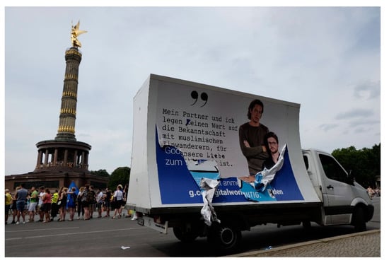 I included a second campaign poster by the AfD, which was part of the party’s 2016 election campaign for the Berlin House of Representatives (see Figure 2 below). The poster in Figure 2 targeted LGBT voters in the state of Berlin specifically and was received with mostly negative public reactions within the LGBT community itself. As an example, the AfD’s truck parading the controversial poster at the Berlin Christopher Street Day (CSD) parade preceding the 2016 Berlin House of Representatives election led to the poster being demolished (see Figure 2).