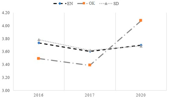 Variation in teacher perceptions at different points in time. EN—experience networks; OK—Olympic knowledge; SD—skills development.
