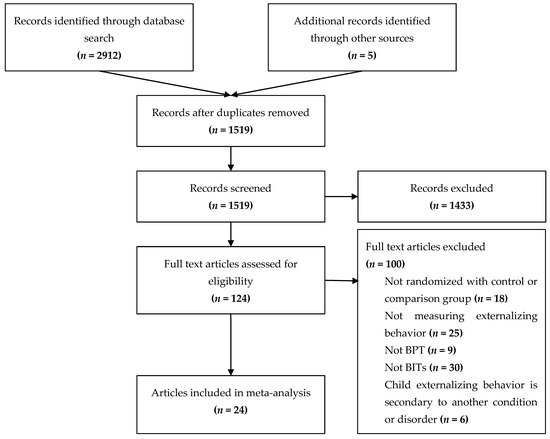 This search yielded results with 2912 articles; five additional articles were included that were cited in articles or previous BIT BPT meta-analyses. From the initial search, 1398 duplicate articles were removed. Of the remaining 1519 articles, 1433 were screened and were removed due to inclusion and exclusion criteria. Lastly, 124 full text articles were assessed for eligibility, and 100 were excluded due to inclusion and exclusion criteria, thus resulting in 24 articles that met inclusion criteria. The final review included 24 randomized control or comparison trials (RCTs) published between 2000 and 2020 (total n = 3957).