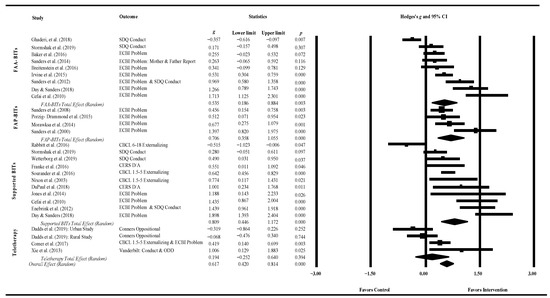 The most widely supported evidence-based treatment is BPT usually delivered in face-to-face format (Chacko et al. 2017; Chorpita et al. 2011). BPT uses behavioral principles to change child behavior by teaching positive parenting strategies (e.g., one-on-one time, positive reinforcement, timeout). There are several well-established FTF BPT manualized interventions (e.g., Incredible Years, PMTO, PCIT, Triple P, HNC). Previous meta-analyses on BPT found significant small to large effect sizes on child disruptive behavior (d = 0.42 to 0.88; Comer et al. 2013; Lee et al. 2012; Leijten et al. 2013; Lundahl et al. 2006; Mingebach et al. 2018; Maughan et al. 2005; Serketich and Dumas 1996). Recently, researchers have partially examined the effects of BIT BPT compared to FTF BPT. The present study examined the efficacy of BIT BPT, the effect of different levels of human support, and for which populations are BIT BPT effective.