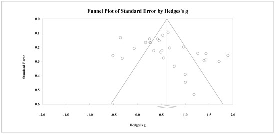 Risk of bias was analyzed by evaluating funnel plot symmetry and calculating Rosenthal’s Fail-Safe N (Rosenthal 1979). The funnel plot in Figure 3 displays the studies’ effect estimates (Hedges’s g; x-axis) against their precision, as measured by their standard errors (y-axis). Studies that are more precise with smaller standard errors cluster around the central line, which represents the overall effect size of the studies (Hedges’s g; vertical line). Studies without bias and between study heterogeneity form a symmetrical funnel with studies clustered around the center line. After a collaborative review, the funnel symmetry was determined to be asymmetric (Borenstein 2005; Sterne et al. 2011). For all studies (i.e., BIT compared to active and waitlist controls), 14 of the studies fell within the funnel plot and, thus, clustered around the overall effect size, but 14 studies pulled away from the mean effect size of the funnel plot. Eight studies with relatively low effect sizes pulled away to the left, and six studies with relative high effect sizes pulled away to the right. Egger’s regression (Egger et al. 1997; t (26) = 1.92, p < 0.05) confirmed asymmetry. These results suggest that the effect may be biased. The studies that fell outside of the funnel plot were evaluated for commonalities that may have introduced systematic error (e.g., level of human support, participant characteristics) and explained the resultant bias. Five of the studies (Dadds et al. 2019; Ghaderi et al. 2018; Rabbitt et al. 2016; Sanders et al. 2014) that fell outside of the funnel plot pulling towards the left were studies that compared BIT to active controls. Studies that compared BIT to active controls may have introduced systematic error. Additionally, Rosenthal’s Fail-Safe N was calculated in order to estimate risk of bias. The Fail-Safe N calculation resulted in 1492 “file drawer” studies, i.e., 1492 studies with an effect size of zero would need to be added to the analysis to render the overall effect insignificant (Borenstein et al. 2009).