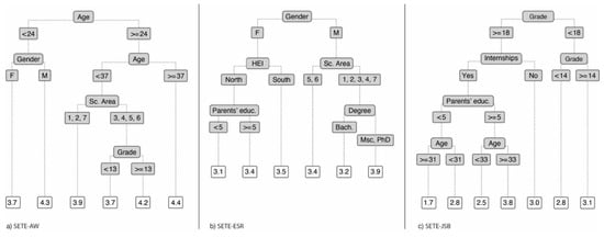 The Recursive Partitioning model (Rpart) developed for the SETE-AW subscale explained 63% of the data variance (i.e., deviance explained). Its simplification resulted in a tree with six leaves (Figure 1a; below). In this model, as in the regression model, the age of graduates was the variable best at explaining self-efficacy in adapting to work (relative importance = 31.5%), followed by scientific area (relative importance = 25.3%). The variables gender and grade also explained the data, with relative importance of 22.60% and 20.61%, respectively (Table 2). Regarding the SETE-ESR subscale, the Rpart model explained 42% of the data variance, and its reduction resulted in a tree with six leaves (Figure 1b; below). As in the regression model, gender best explained self-efficacy in the emotional self-regulation during job-seeking (relative importance = 41.05%). The variables parents’ level of education and scientific area were also found as important (relative importance = 22.77% and 20.34%, respectively). The variables HEI and highest degree had lesser relative importance (<12% and >4%) (Table 2). The Rpart model developed for the SETE-JSB subscale explained 16% of the data variance, and its reduction resulted in a tree with six leaves (Figure 1c; below). The graduates’ final average was the variable that best explained the self-efficacy of job-seeking behaviours (relative importance = 53%), followed by internships (relative importance = 29%). Age and parents’ level of education were also important, although with lesser relative importance (<20%) (Table 2).