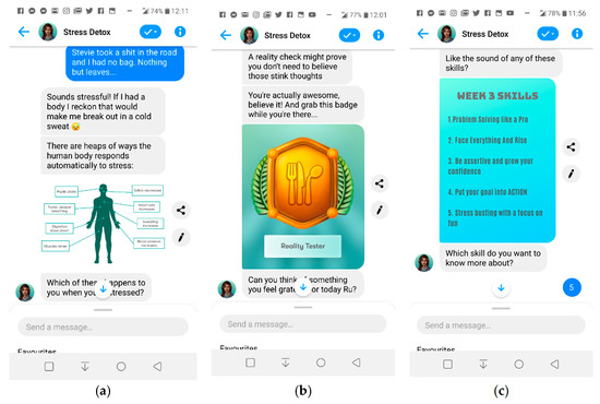 Screenshots of: (a) day four Stress Psychoeducation module; (b) day ten Reality Check module; (c) day thirteen Perspective module.