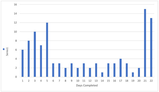 Days completed of the 21 Day Stress Detox programme. (Day 22 was ‘content-free’ and consisted of a message prompting the participant to complete the post-intervention assessment.) The average number of completed modules was 19.3 (SD = 15.3). Twenty-six percent (n = 31) completed between 30 and 51 modules and 23% engaged with fewer than five modules. One participant accessed different modules 73 times (completing several modules more than once) during the programme.