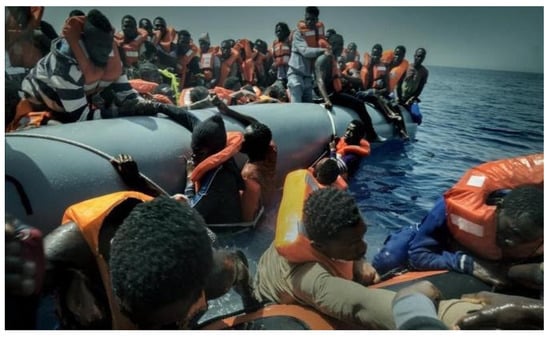 Three media images were included in the questionnaire. The first two belong to scenes of migration in the Mediterranean (Figure 1 and Figure 2) and the third to refugees in Mexico (Figure 3). The images were chosen from a wider selection since they depicted different moments experienced by migrants in forced displacement. One image was about displacement by sea and the risks involved, the second about transit, and the last reflected the walls and deprivation of freedom of passage and movement of migrants.