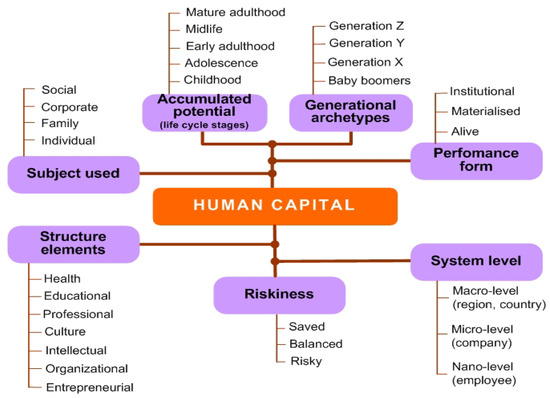 Broadly elements of HC can be classified according to the following features—subject used, performance form, structured elements, types and components, level of system, generational archetypes, accumulated potential (or human life cycle stages) and riskiness (Figure 2). Consideration of specific type of HC determines its properties, assessment methods and management tools.
