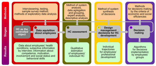 There are many different approaches to systematization of HC. For the purpose of sustainable community development, authors (Roseland and Spiliotopoulou 2016) use the term “Community Capital” to include natural, physical, economic, human, social and cultural forms of capital. In the works of (Flores et al. 2020a, 2020b), human-oriented architecture and human-centric architecture model are proposed. In their paradigm HC (workforce) based on competence, human life cycle and environment scenario. The companies’ HC could include organizational (structural) capital (Youndt 2000), social and consumer capital (Edvinsson et al. 2007) as a component of intellectual capital in the form of skills and knowledge accumulated by the company, as well as nonphysical resource for creating added value (Samad 2020; Gratton and Ghoshal 2003). In (Armstrong 2008), great attention is given to the institutional components of a companies’ HC.