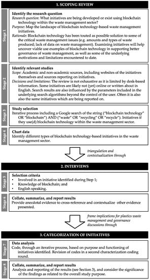 The research question framing this paper is: how can blockchain technology support the governance of circular plastic waste management? For this purpose, a three-step process was adopted: (1) a scoping review identified reported blockchain technology-based initiatives within the waste management sector; (2) semi-structured interview data were used to triangulate and validate scoping review data about the initiatives, as well as provide anecdotal contextualizing evidence; and (3) categorization through qualitative coding of initiatives according to their attributes was used to explore and identify implications for plastic waste management and governance discussions. This three-step process is summarized in Figure 1.