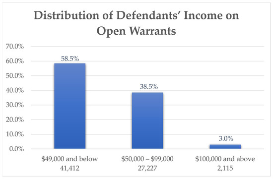 To estimate income, which was not in the warrant data, we used the Google Maps API (https://developers.google.com/maps/documentation/geocoding/overview, accessed on 16 December 2020) to geocode defendants addresses into corresponding latitudes and longitudes, which we used to generate maps in Tableau Public. We linked the geographic coordinates to their corresponding census blocks, which we mapped from The Federal Communications Commission (FCC) API at https://geo.fcc.gov/api/census/ (accessed on 16 December 2020). We used census blocks to link the warrant dataset to data that we downloaded from the US Census’s American Community Survey, 2019, which estimates the median income of people in block groups. Estimates from the US Census American Community Survey allowed us to approximate indirectly the income levels attained by road users that received bench warrants.