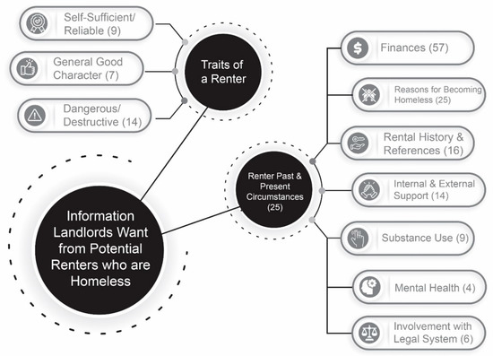 Some landlords desired information that was linked to the character and/or personality of a renter. More than half of the responses under this category were connected to self-sufficiency or reliability. Landlords were concerned with ability and willingness to follow through with rent payments: “I would want to know that they could pay rent…it’s not about the homelessness or really anything that they have done in the past if they are a renter that are improving themselves” (Participant 2). Some landlords were interested in the attitude of the renter towards their situation, such as Participant 16 who said they needed “evidence of significant personal effort to take advantage of opportunities to change their circumstance”. Others vaguely noted that, simply, potential tenants should have “good character”, such as being honest or trustworthiness, but in most cases the definition of good character was not clear. However, a few landlords mentioned wanting to meet face-to-face to make a judgement. Of all the character-related responses, several landlords expressed apprehension connected to individuals who were homeless being destructive and dangerous, and they wanted to protect their property and other tenants.