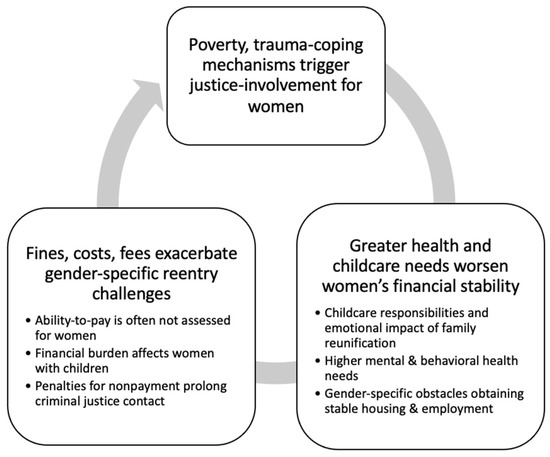(1) The increase in women’s mass incarceration over the past forty years raises questions about how justice-involved women experience the financial aspects of the criminal justice system. (2) We conducted in-depth interviews with twenty justice-involved women and seven criminal law and reentry professionals, and conducted courtroom observations in southeastern Pennsylvania. (3) The results from this exploratory research reveal that women’s roles as caregivers, their greater health needs, and higher likelihood of being poor creates barriers to paying fines and fees and exacerbates challenges in reentry. (4) These challenges contribute to a cycle of prolonged justice involvement and financial instability.