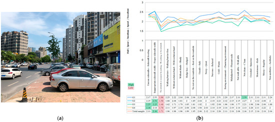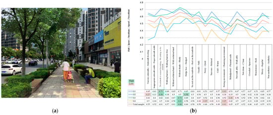 (a) Street environment before intervention (original photo); (b) SD analysis method—4 subgroups and total sample street environment pre-intervention evaluation scale.