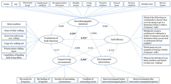 Structural equation modeling (SEM) was established to analyze the data to determine the relationship between sociodemographic characteristics, body functions, self-efficacy, current living environment and street environmental interventions. The numbers in the figure are standardized path coefficients, and ** indicates significance (** p < 0.01).