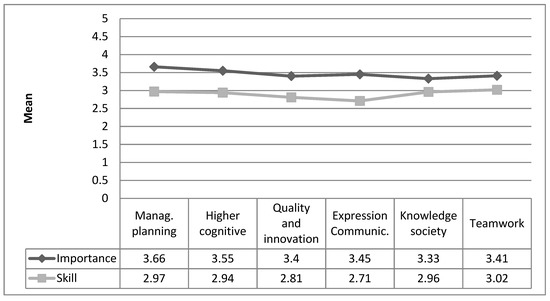 If we compare the competences globally according to the taxonomy that we present in Figure 1, there is a remarkable difference, with values considerably higher in importance than in the skill in the following groups of competences: management and planning, higher cognitive, quality management and innovation, expression and communication. In the competences of knowledge society and teamwork, the distance between importance and dominance was lower; however, values that emphasized the importance of skill in these competences were maintained.