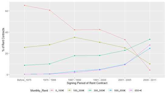 As per the long-term rental market, the rural exodus of the 1960s and the immigration caused by the decolonization process in the 1970s increased the demand for long-term rentals in Lisbon, generating marked social tensions between natives and immigrants (Pinto 2008; Agarez 2018). The rent freezing legislation of the mid-1960s had made the rental market very unattractive to homeowners in Portugal (Perista and Baptista 2007). It affected the supply of long-term rentals in the housing market and increased the rent of long-term rentals in the city. The 2007–2008 global economic crisis, which led Portugal to request for financial assistance from the European Commission, the European Central Bank and the International Monetary Fund, marked the beginning of austerity policies that liberalized the long-term rental market, relaxed the land-use regulations and created a tax regime favorable to real estate speculations, which aggravated the problem of access to housing in Lisbon and other major cities in Portugal (Allegra and Tulumello 2019). A detailed examination of the long-term rental market in Lisbon shows that the monthly rent in 65% of the total rent contracts signed before 1975 was less than EUR 100 and in only 2.4% of the contracts the monthly rent exceeded EUR 650. In the 2006–2011 period, the proportion of rental contracts of less than EUR 100 decreased to 4.12% and that of above EUR 650 increased to 27.8% (Figure 2). This shows a considerable increase in monthly house rents in Lisbon. According to recent estimates by INE, the median price of new rental contracts has increased by 21.2% in Portugal and 24.3% in Lisbon between 2017 and 2019 (INE 2021a).
