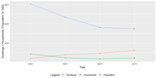 The evolution of family dwellings, household and population in Lisbon, 1981–2011. Source: Own elaboration, with data from Census records 1981–2011.