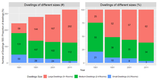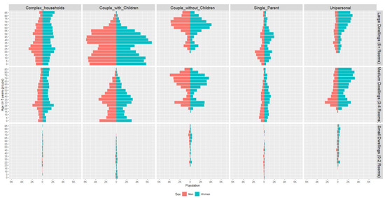 Relationship between the size of dwellings and household type, 2011. Source: Own elaboration, with data from Census records 2011.