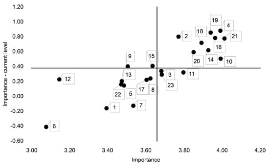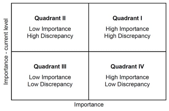 In order to complement the limitations of Borich’s needs analysis, many studies (; ; ) suggest priorities by using the needs analysis of Borich and the Locus for Focus model of () in combination. The Locus for Focus model has the advantage of being able to easily display results visually by dividing the average value of importance on the horizontal axis and the average value of the difference between importance and current level on the vertical axis, as shown in Figure 1 (). In this model, the first quadrant, which indicates high importance and a high degree of discrepancy between the importance and the current level, is the highest priority and can be viewed as the area that needs to be improved most urgently (). In this study, Borich’s needs analysis and the Locus for Focus model were used to determine the highest priority in employment support programs for hospitality undergraduate students.