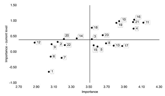 Figure 2 shows the results of analyzing the priority of employment support programs using the Locus for Focus analysis. The name of the employment support program corresponding to the number in the grid can be identified by the number in the first column of Table 2. Based on the average of the importance of employment support programs recognized by the 2-year university majors (mean = 3.53) and the average of the difference between importance and current level (mean = 0.40), nine factors were included in the first quadrant (top right) on the coordinate plane, namely industry–academic cooperation courses, field practice programs, career seminars, individual career counseling, employment information support, overseas employment support, overseas training support, certificate programs, and mentoring.