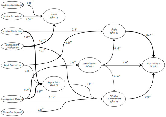 Management support was divided into three components, and it can be seen that although appreciation is supported by the relationship with management and superiors characterized in management support, there is no relationship between these two constructs and management competence. These results support the choice to deconstruct the original concept of management support in order to better understand its relevance to organizational pride. The model shows that management support and appreciation have a positive effect on affective commitment, supporting H7(b). Although appreciation has no effect on organizational pride, management support has a positive indirect effect through organizational identification, supporting H5(a) and partially H5(b). Management competence was also found to be related to affective commitment, but even more with the moral of the organization. It can be concluded that the relationship between employees and management, the perception of management competence and the feeling of being a valued member towards the organization influence organizational commitment through affective commitment but not organizational pride directly. Regarding co-worker support, it was only possible to confirm its positive effects on affective commitment, validating H7(a), but there was no evidence to support H6(a) not (b). Although not confirming Welander et al.’s (2017) position on management and co-worker influence, these conclusions do not contradict the idea that management support not only promotes job satisfaction but also reduces turnover (Arnett et al. 2002; Holtom et al. 2008).