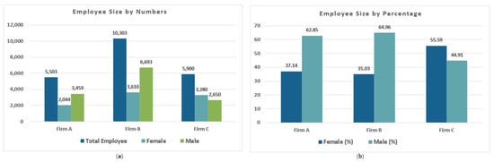 All three firms have some similarities and differences concerning ownership structure, employee size, production capacities, annual turnovers, potential clients, and other capabilities. (see the detailed summary in Appendix A Table A1). All three cases belong to the large category in terms of manufacturing operations. The three firms divided their operational activities into Account and finance, supply chain, marketing and merchandising, production, human resources and administration, and research and development departments. Figure 2a presented the employment size of three firms. The total employees of firm B were two times greater than the others. The female employees’ percentage of firms A and B are less than 40 percent (shown in Figure 2b), which is significantly lower than the industry average of 75 percent.