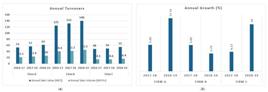 All three firms’ yearly sales quantities and values have been gradually increasing during the last three years, shown in Figure 3a. Nevertheless, the average prices of all three firms gradually decreased in FY 2018-19 than in the past years. The growth rates of firm A and C showed in Figure 3b, are nearly double in FY2018-19 than the previous year. However, firm B experienced a slight decrease during the same period. The annual production capacities of case B are twice that of firm C and almost one-third more than case firm A (shown in Appendix A Table A1). However, the average production process loss of firm B is significantly less than the other two firms A and C, which means the firm is more efficiently use its capacities.