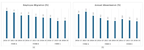 All firms are still struggling to reduce absent rates below 5 percent, shown in Figure 4b. Still, the job migration rates of case A shown in Figure 4a are higher than the others. Firms B and C documented employees’ absent rates of 5.3 and 5.2 percent, respectively, which are the lowest in 2019. However, the job migration rate of these two firms B and C, reduced to 4.9 and 4.2, respectively, in 2019, which is acceptable rates by manufacturers. In contrast, firm A is experiencing higher absent rates and employee migrations for the last three, comparing the other two firms shown in Figure 4a,b. However, it is gradually improving the annual rates of both categories in 2019 considering the past three years.