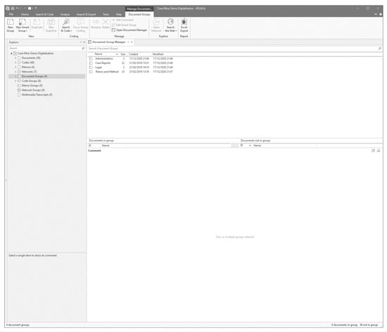 The concrete experience is the case of Mira and the abstract conceptualization is, let us say, related to social work interventions in meeting Mira’s basic needs. When the social worker (Ben) and his supervisor (Anna) are assigned Mira’s case, the social work practice and interventions to solve the problems and issues related to Mira become a new concrete experience for them. Both Ben and Anna were required to gather preliminary background information and create an information system related to the case. An information system based on digital technology has the potential to amplify abilities of social workers, and to enhance effectiveness and efficiencies in SWS (; ). In ATLAS.ti v.9.0, an information system related to the case of Mira is therefore created as a New Project. The New Project is given a name (in this case, it is labeled as Case Mira). Under the project—Case Mira—different documents containing vital information to manage Case Mira are gathered and classified under different “Document Groups” such as case reports, legal documents, administrative material, etc. (as shown in Figure 2). For information on how to create a project and organize documents in ATLAS.ti, refer to the ATLAS.ti v.9.0 manual ().