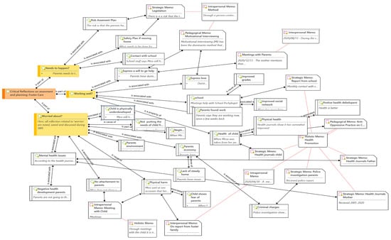As observed in Figure 4, by clicking some buttons in ATLAS-ti, Ben and Anna could work on making deep critical reflections assisted by a panoply of digitalized information through network, and codes—containing vital notes, and memos—where different types of critical reflections are organized and recorded. The digitalized critical reflection based on facts and information gathered and organized in ATLAS.ti enhances the reconstruction and deconstruction tasks, and promotes the accountability of social work interventions and practices in Case Mira. The digitalized critical reflection supports the justification of professional actions and the knowledge-base of social work interventions and practices undertaken by Ben and Anna. Finally, digitalization through ATLAS.ti allows Ben and Anna to enhance embedded critical reflections in the case management and promoting the learning culture in SWS.