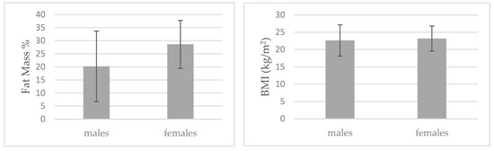 Regarding anthropometry (Figure 1), significant differences were founded between sex for mean fat mass (t = −3.385; p < 0.001; d = −0.689). The females presented 28.62% (±9.15%) and the males 20.20% (±13.47%) of fat mass. The body mass index presented no significant differences between sex (t = −0.622; p = 0.535; d = −0.127). Figure 1 present the comparison between males and females for fat mass (left) and body mass index (right).