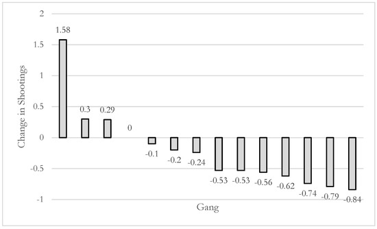 Figure 1, below). Of the 14 gangs that participated, the majority responded positively to focused deterrence, as was anticipated. However, three gangs bucked that trend and were associated with more shootings after efforts were made to prevent violence; the intervention backfired for those gangs. One gang had neither a reduction in shootings nor an increase.