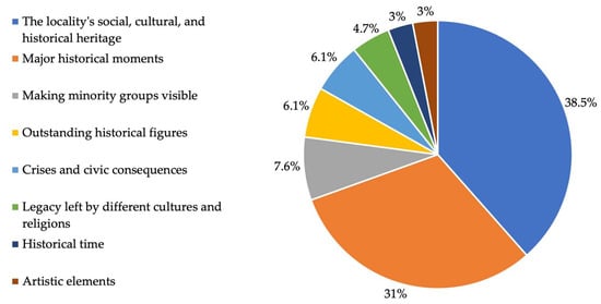 With respect to the themes (Q2.1), there were eight different ones used (see Figure 2). Of these, just two represent 69.5% of the inquiries. They are linked to the locality’s social, cultural, and historical heritage (38.5%) and to major historical moments (31%). These data confirm the results of Massip et al. (2020) for whom the fact that such themes as heritage or outstanding historical moments are still predominant is linked to the stagnation of school history as a discipline. This is also supported by the curriculum itself: “the History that is presented is that of the great facts and events, and it is almost totally Eurocentric” (p. 184).
