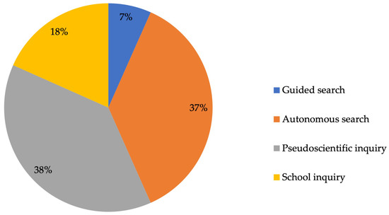 From a chronological perspective, it is noteworthy that, in the first edition of the Congress, inquiry that followed an autonomous search method prevailed. In the second and third editions, there was a considerable increase in the number of experiences based on a pseudoscientific inquiry method. In the last edition analyzed, however, the data reflect a regression towards the use of methods that are further away from the school inquiry proposals (see Figure 6).