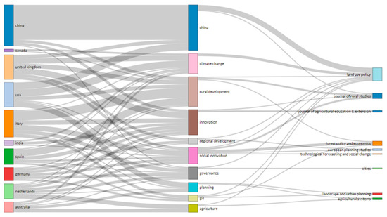 The three-fields plot (Sankey diagram, Figure 1, as analyzed in Riehmann et al. 2005; Fatehi et al. 2020), shows which countries are publishing most on which topic, based on smart villages’ related keywords and which journals are publishing on which topics. The left field contains the countries of origin of the sources, the middle field contains the corresponding keywords, and the right field contains the sources of papers used as imported data. The number of items selected in each case is ten. This plot was created to depict the proportion of research topics for each country and the recency of the papers that they cited. The largest numbers of smart village researchers are located in China, Italy, the United Kingdom, and the United States. Despite the global interest in smart villages, different emphases are observed in the research of different countries. The main interests of smart village researchers in China are rural development, innovation in general terms, and more specific social innovation. From this group of researchers, special emphasis is also placed on the research of smart villages that focuses on their country of origin. The interests common to most researchers are rural development and innovation, climate change, and region-specific issues related to government decisions and policies.