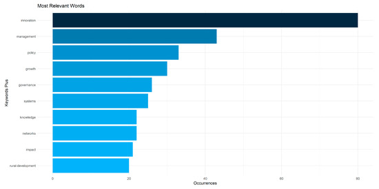 The most relevant keywords used in the academic articles (Figure 2), which are the base of the present research, are mainly related to innovation, management, policy, growth, and governance.